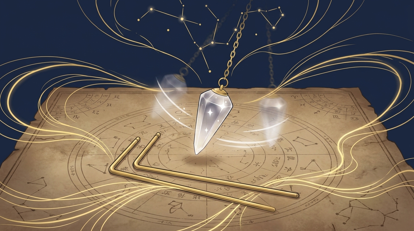 ダウジングの道具(ペンデュラムやロッド)は、使用者の微細な筋肉の動き(不随意筋運動)に反応して動くとされています。科学的には「観念運動効果(イデオモーター効果)」と呼ばれる現象で、潜在意識が無意識のうちに体を動かし、それが道具の動きに反映されるという考え方です。